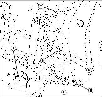 e. Swing cylinder rod and boom (E) (both sides of backhoe).