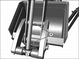 j. Bucket pivot pins (K) on dipper stick.