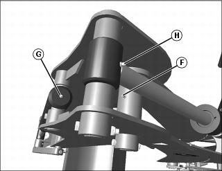 f. Dipper and boom pivot pin (F) and bucket cylinder pivot (G).