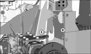 6. Slowly lift rockshaft arms, making sure pins engage into hooks on backhoe. Check to be sure both lower pins (D) on backhoe engage both hooks (E) on tractor RSA mounting plates.