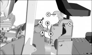 4. Fully lower tractor rockshaft arms (A). Align rockshaft pins (B) with hooks (C) on backhoe, and back tractor into position.