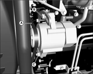 3. Apply moderate thumb pressure to belt (A) halfway between the pulleys. Belt should deflect inward approximately 9 mm (3/8 in.).