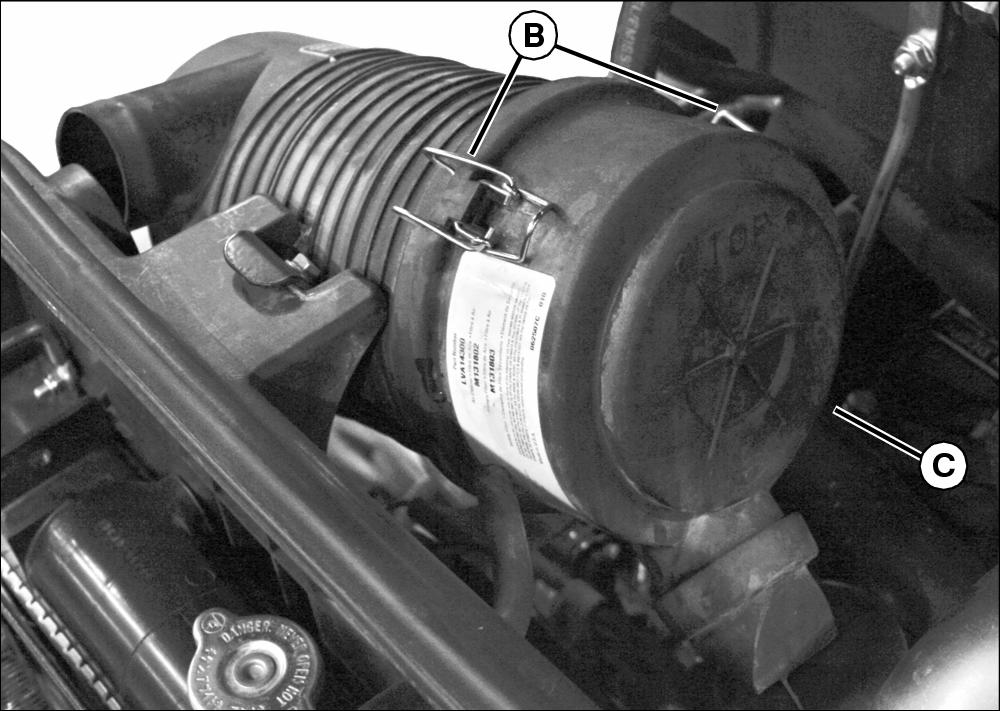 5. Tilt canister up and release latches (B) and remove air cleaner canister cover (C).