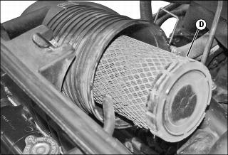 6. Remove and discard primary element (D). Clean out any dirt in canister, taking care not to damage the secondary filter element. Replace with a new primary filter element.