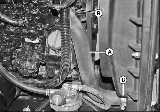 NOTE: Upper air intake flange must be properly installed into shroud adapter (A) on radiator support frame.