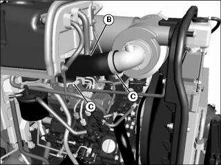 • Model 3032E: Locate the lower air intake hose (B) and tighten two hose clamps (C).