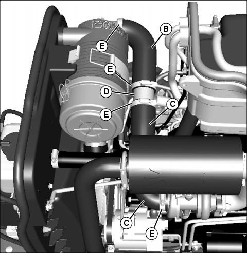 • Model 3038E: Locate the two lower air intake hoses (B) and (C), and the tube fitting (D) below muffler, and tighten four hose clamps (E).
