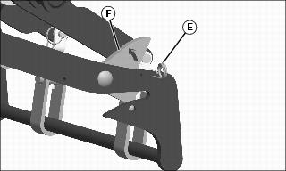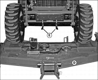 5. Drive tractor slowly, smoothly and straight over mower deck making sure forward lift link (D) aligns hangers (E).