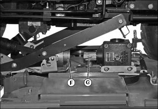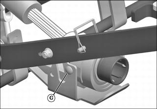 8. For initial installation of mower deck, ensure that carriage bolts (G) on PTO coupler support are snug, but allow limited pivoting of PTO coupler.