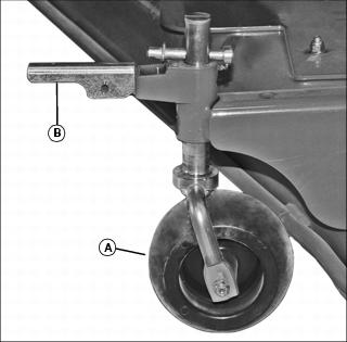 2. Ensure that all four mower deck gage wheels (A) are in unlocked position, with handles (B) parallel to ground. Deck should be resting fully on ground.