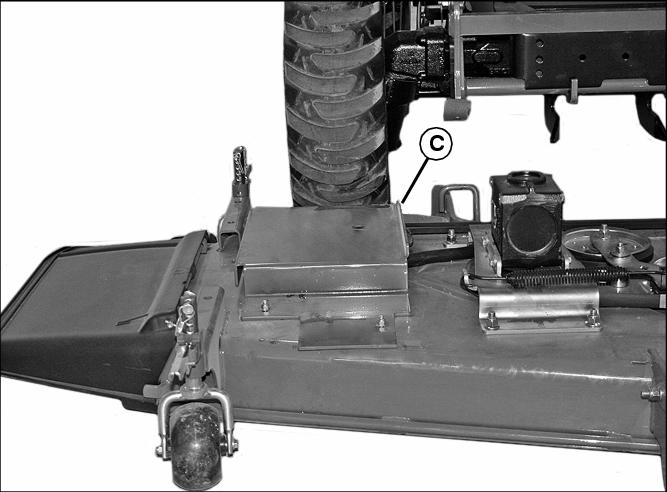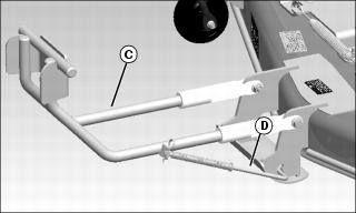 6. Make sure front link (C) of mower is unfolded from top of deck and spring rod (D) is inserted in slot at front of deck.