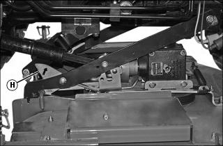 9. Dismount tractor and ensure locks (H) on both sides have dropped to locked position shown. Mower may sometimes have to be pulled rearward slightly to engage lock. On first installation, mower may not lock in position if front link is too short.