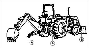 1. Lower backhoe stabilizers (A), and loader bucket (B) to ground.