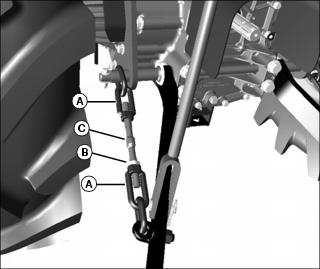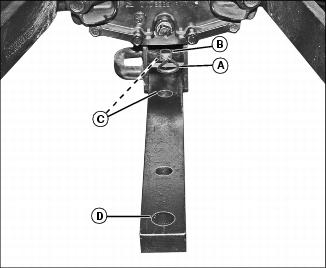 4. Install drilled pins (B) and spring locking pins (A) to lock crossbar (C) in the lowered position.