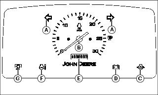 B-Tachometer: Shows engine speed in increments of 100 rpm. Example: If indicator is pointing at 20, then 20x100 = 2000 rpm. Note the special PTO marker. At this engine speed, the PTO rotates at the industry standard 540 rpm.