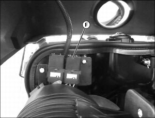 • If your tractor is equipped with the engine overheat protection harness, there will be a relay block (F) mounted to the firewall under the hood as shown. For operation of this system, see below: