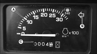 A - Tachometer - Shows engine speed. Engine speed is shown in 100’s. Example: If indicator is pointing at 20 (20 x 100 = 2000 RPM). Note the special marker labeled 540. With the indicator pointing at the 540 marker, this is the proper engine speed for the 540 RPM Power Take Off (PTO).