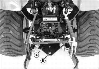 1. Secure the safety chain around the crossbar (A) that supports the lower draft arms (B).