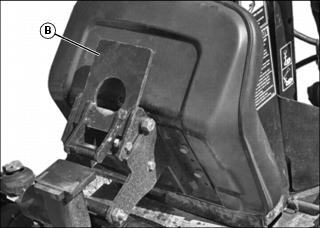 375 backhoe: Press seat latch (B) toward seat to allow seat to pivot forward.