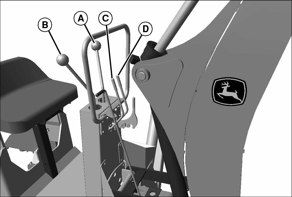 c CAUTION: Avoid injury! Do not use control levers to help you mount or dismount the backhoe. Always use hand rail. Do not operate controls while standing on the ground. Backhoe movements could strike and/or crush you against frame.