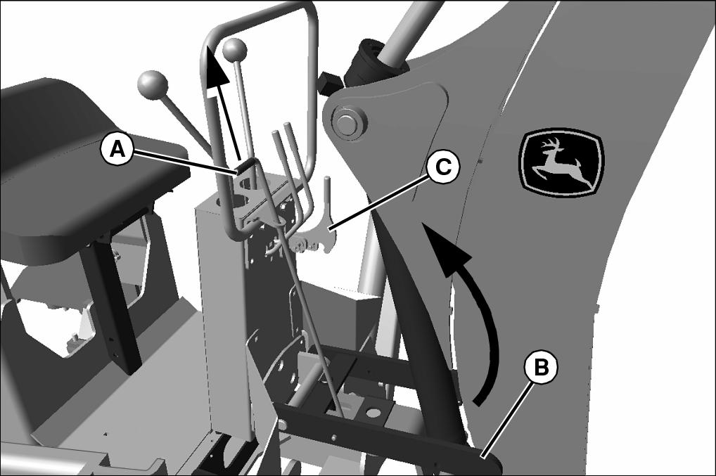 2. Pull lift rod (A) up and towards back of tractor, raising locking device (B) from pin on swing, and locking into latch (C).