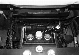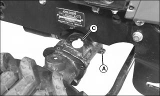 8. Remove dipstick (C) located on right side of front axle and vent plug (D).