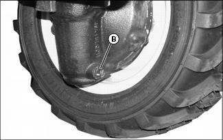 5. Position drain pan under each front axle drain plug (B).
