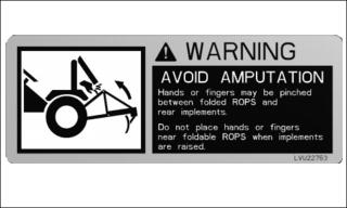 • Hands or fingers may be pinched between folded ROPS and rear implements. Do not place hands or fingers near foldable ROPS when implements are raised.