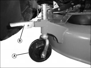 2. Ensure that all four mower deck gage wheels (A) are in unlocked position, with handles (B) parallel to ground. Deck should be resting fully on ground.