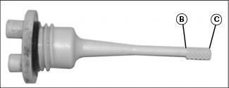 4. Remove dipstick. Oil level should be between high (B) and low (C) levels on dipstick. If oil level is low: