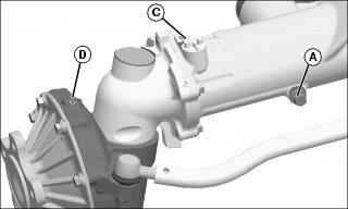 8. Remove dipstick (C) located on right side of front axle and vent plug (D).