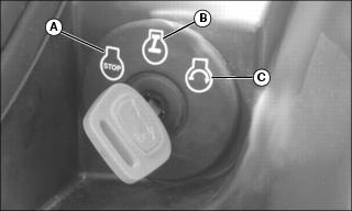 C - START Position - Move key from ON to this position and the starter will engage the engine flywheel to start the engine. Release the key to the ON position.