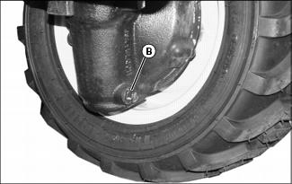 5. Position drain pan under each front axle drain plug (B).