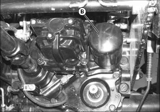 4. Position drain pan under transaxle oil filter (B). Remove and discard filter. Allow residual oil to drain completely.