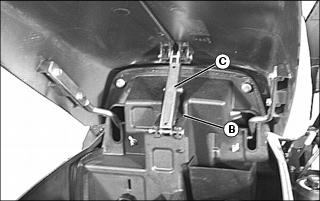 2. Pull center of support bracket (C) toward the front of the machine to release and slowly lower hood.