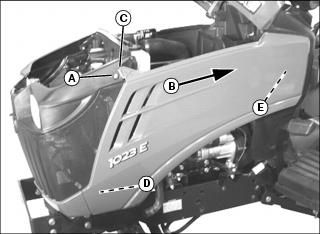 4. Slide the side panel toward the rear (B) until the top (C), front (D) and rear (E) tabs clear their mounting slots in the machine. Remove the side panel.