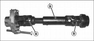 2. Lubricate three grease fittings (B) on mid PTO shaft with recommended lubricant.