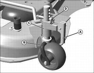 NOTE: After wheels are installed, it may be necessary to lock wheels by pressing downward on handles (A) until they are perpendicular to ground. However, wheels must be in the unlocked position before installing mower on tractor.