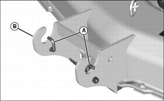 1. Remove nut and lock pin (A) from each side of front draft link bracket (B).