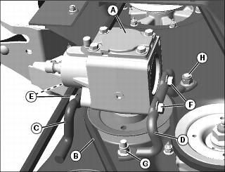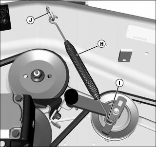 6. Attach spring (H) to tensioner arm (I) and bracket (J) on mower.