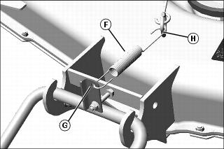4. Install spring (F) through hole in draft link bracket (G) and ring on mower (H).