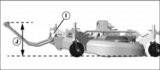 5. INITIAL ADJUSTMENT - With gauge wheels unlocked and mower resting firmly on a level surface, adjust length of bolt (I) to achieve a 290 mm (11.4 in.) height (J) from the center of the draft link front pins to the level surface. This may have to be slightly lower if attaching with H120 loader installed to clear parking stand. The front draft must always be pushed down during drive over or damage to the front draft will occur. Tighten locknut on bolt securely.