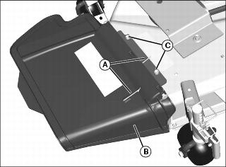 1. Position the discharge chute assembly (B) on the mower and secure with two M8x16 carriage head bolts and two M8 locknuts (C).