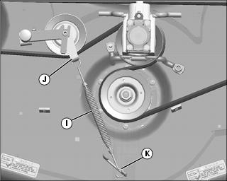 6. Attach spring (I) to tensioner arm (J) and bracket (K) on mower.