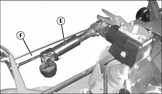 c. Place the rear yoke assembly (E) in the hanger (F) on the right side of the mower.