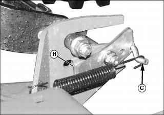8. Raise the lock lever up (G) to release the left (H) and right rear mower lock.