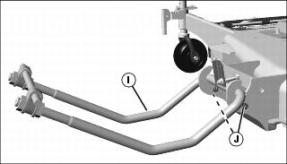 12. When removing the mower for storage, the front draft link assembly (I) can be removed. Remove the tension spring (not shown) and two lock pins (J) and remove the link assembly from the mower.