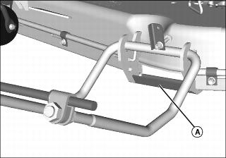 NOTE: If ground conditions are soft, place a piece of plywood under the mower front draft skid (A) before lowering and removal.