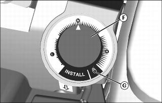 5. Raise the mower fully and rotate the Height-of-Cut control (F) to the lock position (G).