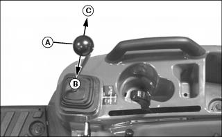 • Push the SCV lever slightly to the right (C) to lower the mower. Do not push the lever fully to the right, to avoid engaging the Regen function of the hydraulic circuit resulting in unintended motion.